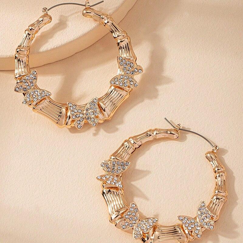 Big Butterfly Bamboo Hoop Earrings For Women Gold Color Full Crystal Stone Butterfly Vintage Girls Earrings Street Wear Jewelry