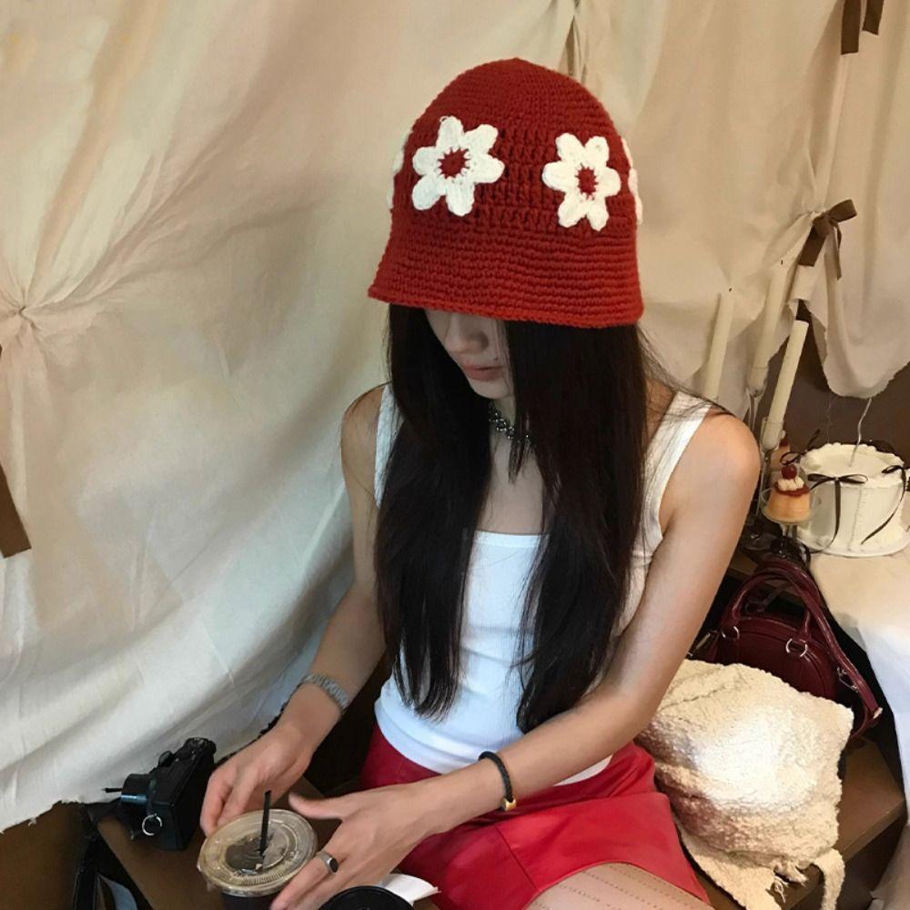 Korean Style Crochet Flower Knitted Hat Sweet Bucket Hat Cute Beanies Hat Girls