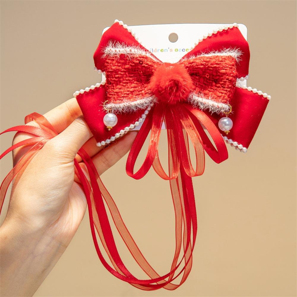 Tassel Red Bow Hair Clip Lion Embroidered Bow Headwear Children's Chinese Hairpin Decoration