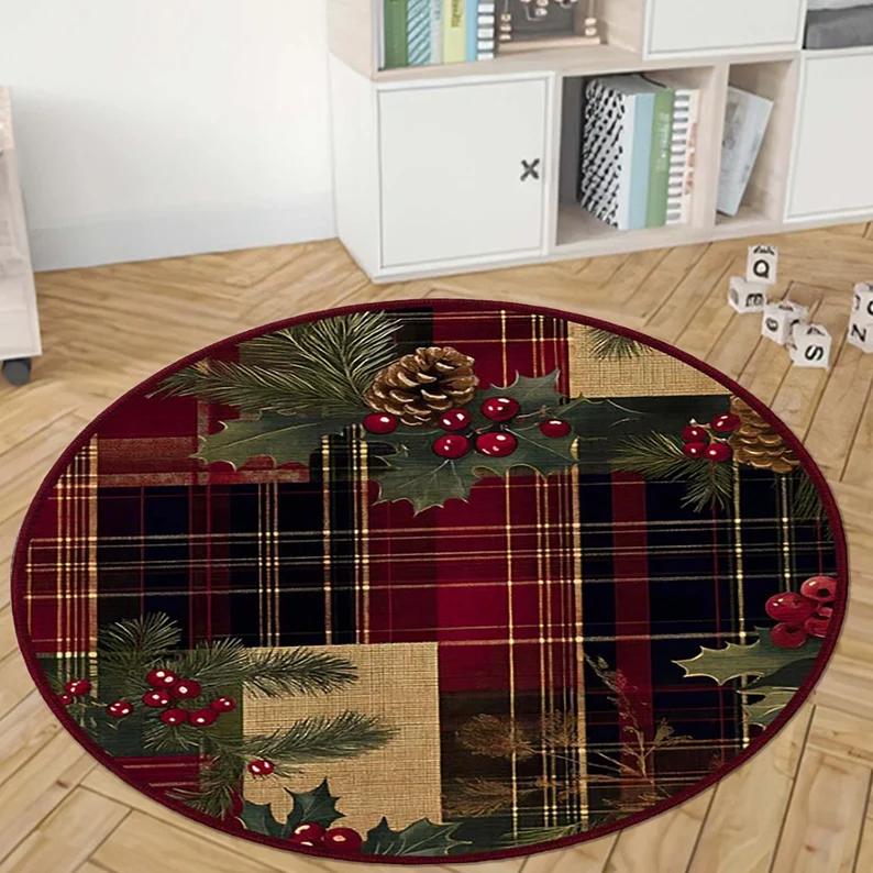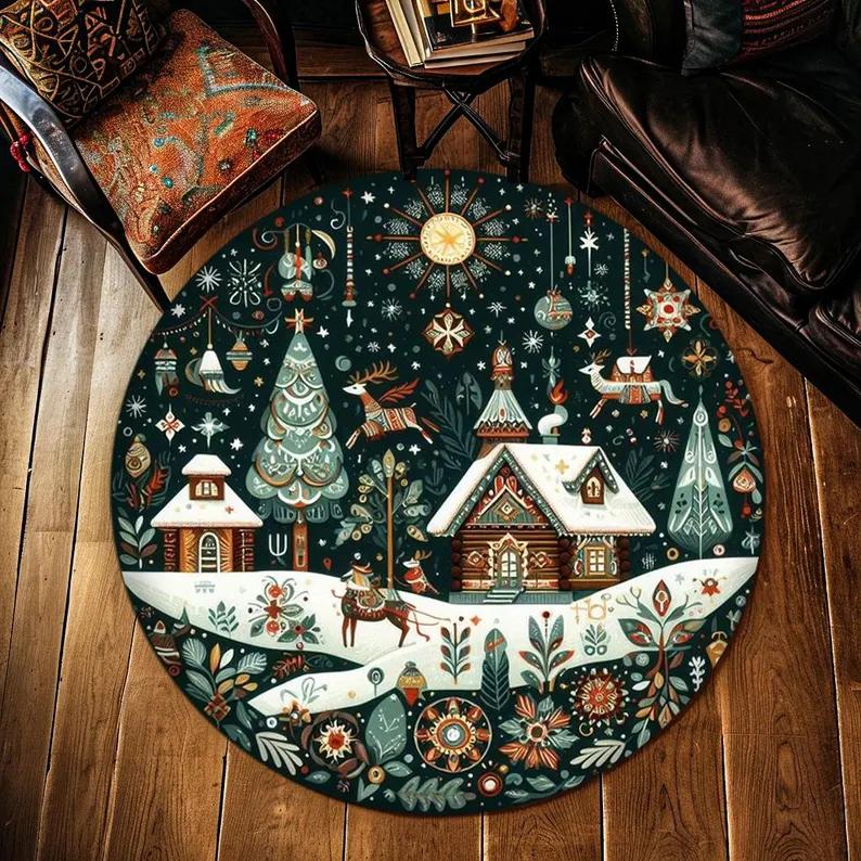 Christmas Village Round Rug Nordic Winter Round Reindeer Ornaments Round Rug Cozy Cabin Round Rug Festive Forest Holiday Decor