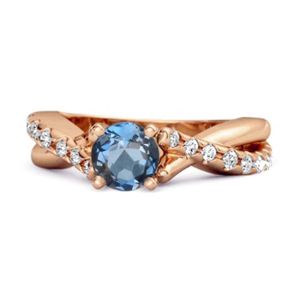 Elegant 925 sterling silver ring with 4mm London blue topaz and CZ accents. Crisscross pavé band design perfect for modern sophistication.