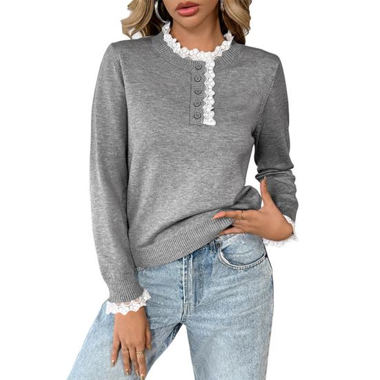 Женский свитер с круглым вырезом, пуговицами на полупланке, длинными рукавами, вязаный, однотонный, с кружевной отделкой, джемпер, повседневная одежда
