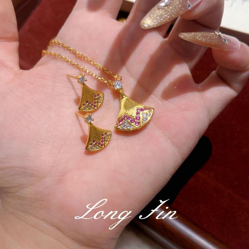 Italian Brushed Small Skirt Necklace Female Fan Shape Gradual Change Pink Diamond Stud Earrings Pendant Set Real Gold Plating