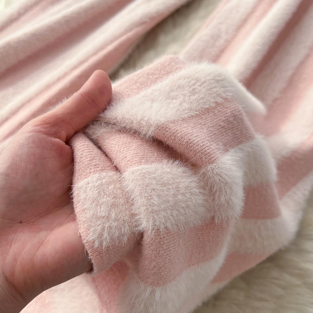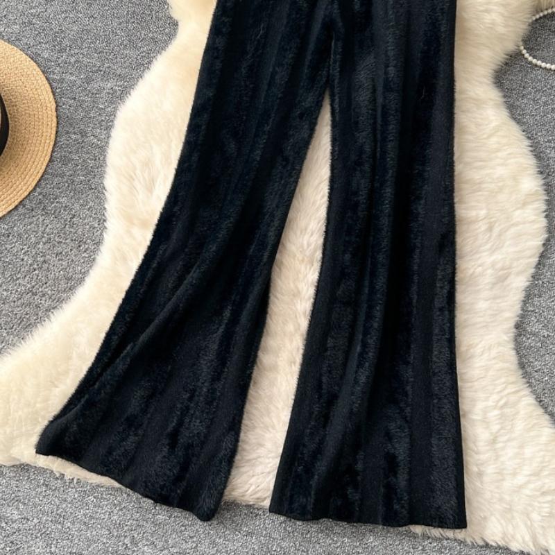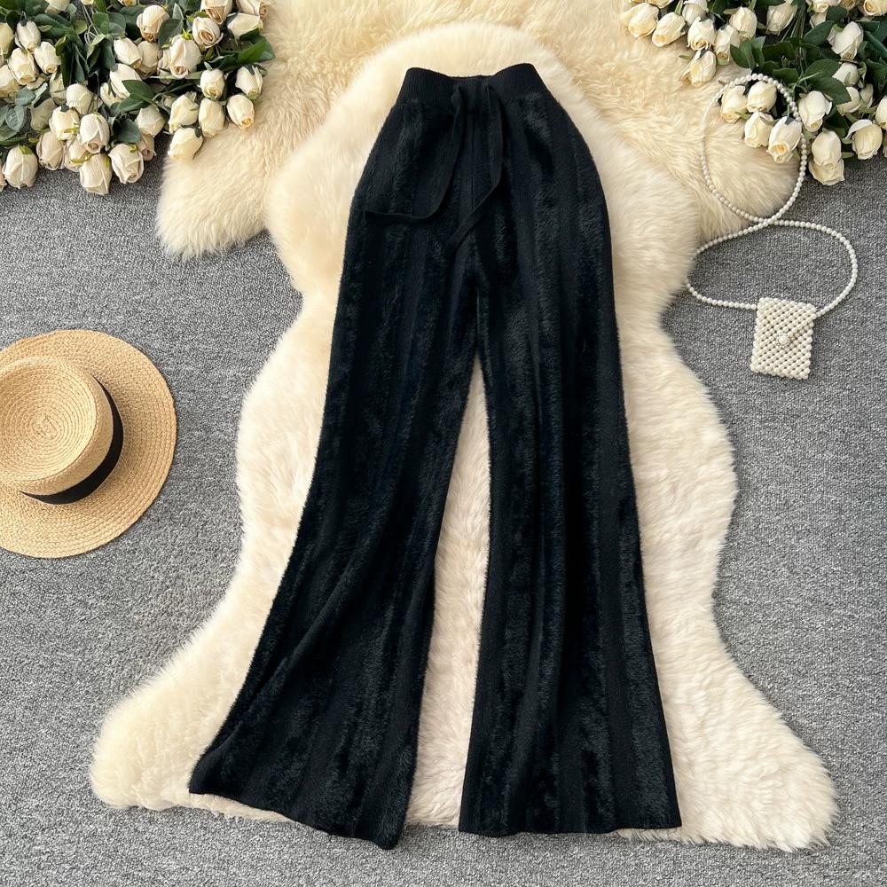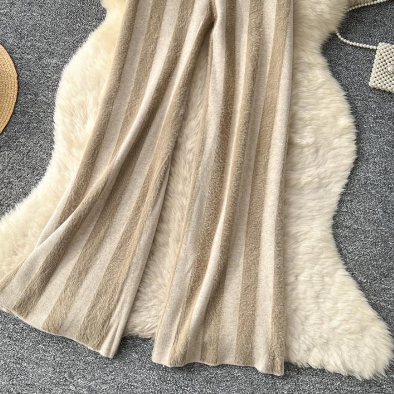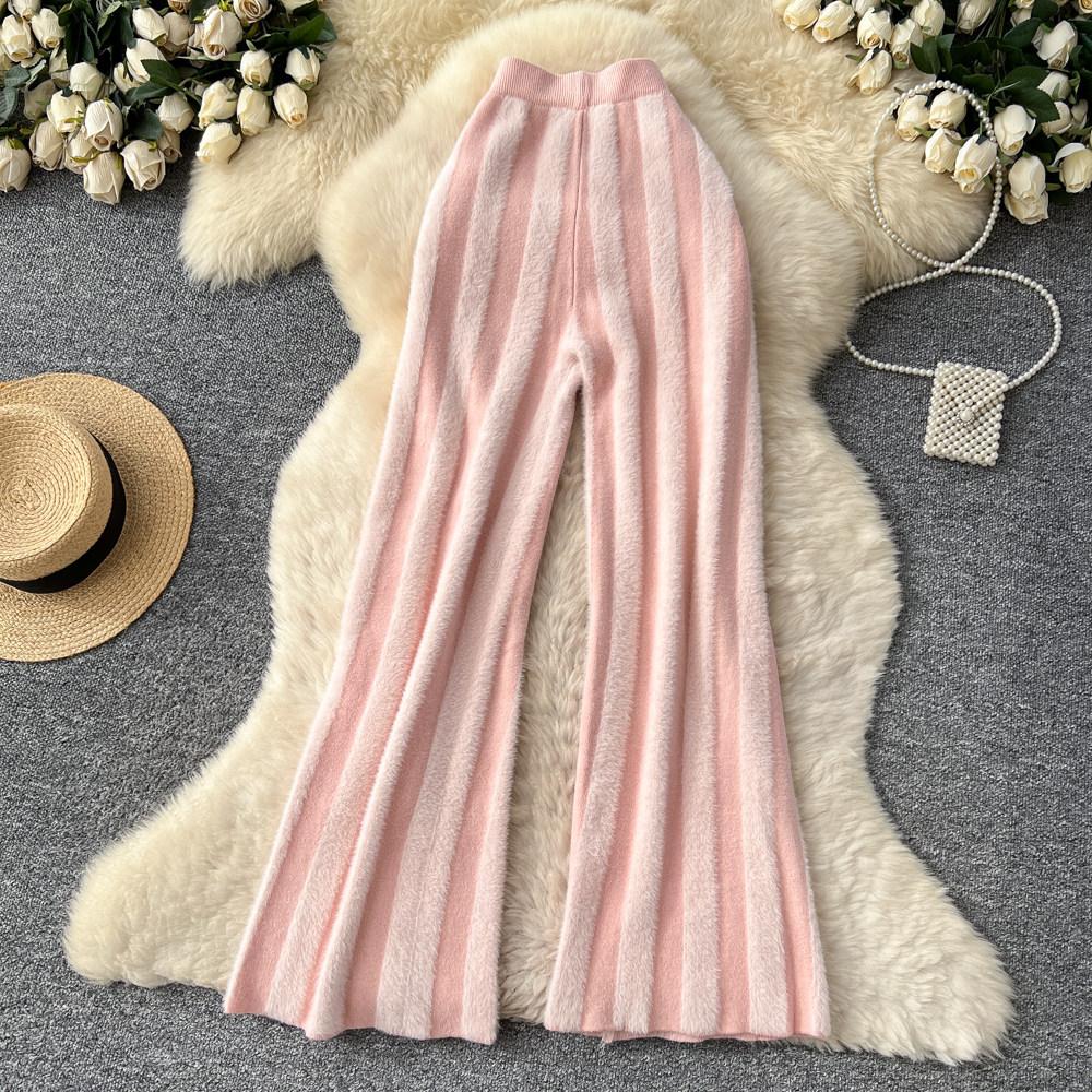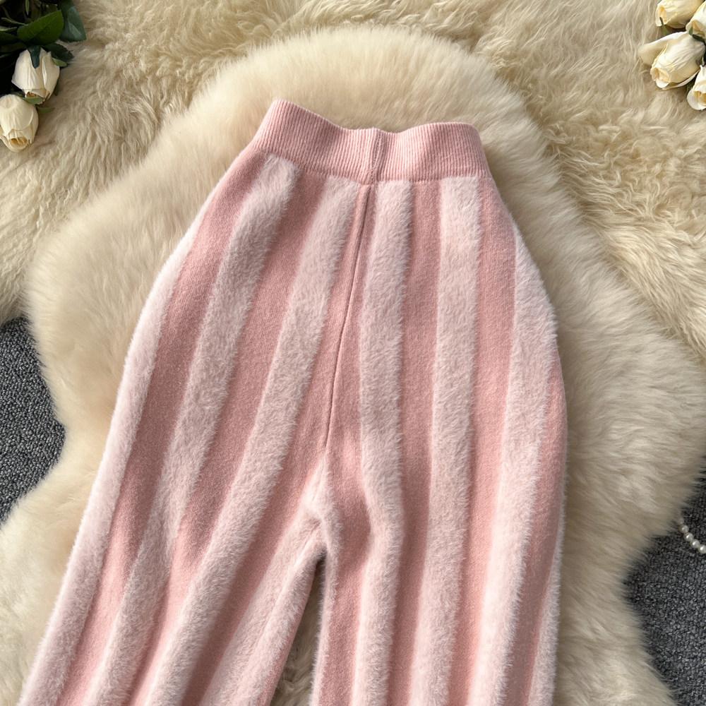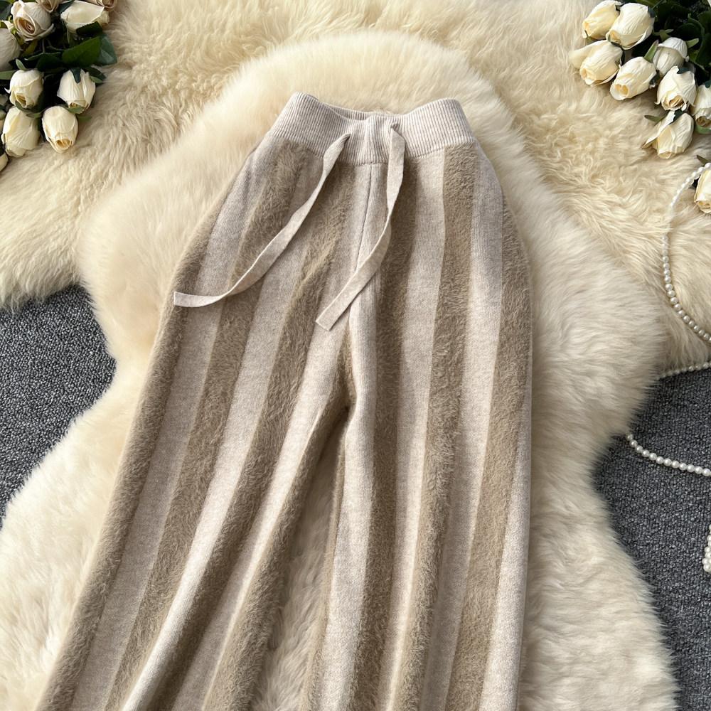 Осень Зима Женский Ленивый Стиль Полосатый Вязаный Свитер Кулиска Широкие Штанины Домашние Штаны