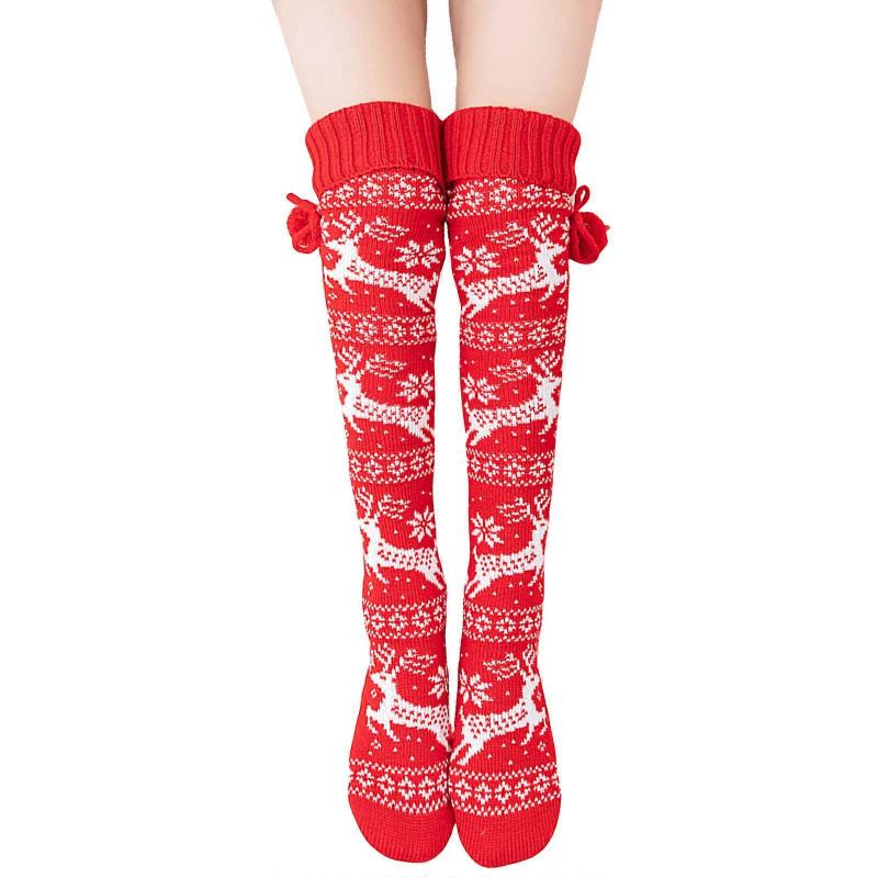 Over the Knee Christmas Long Socks Jacquard Knitted Thigh High Stockings Leg Warmers with Plush Balls Bows for Women Red