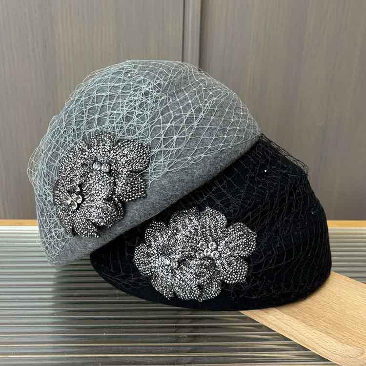 Осень и Зима Новая Легкая Роскошь Сетка Пряжа Стразы Цветок Бутон Шляпа Ретро Элегантная Шляпа Стюардессы Женская Маленькая Моделирующая Шляпка-Цилиндр