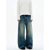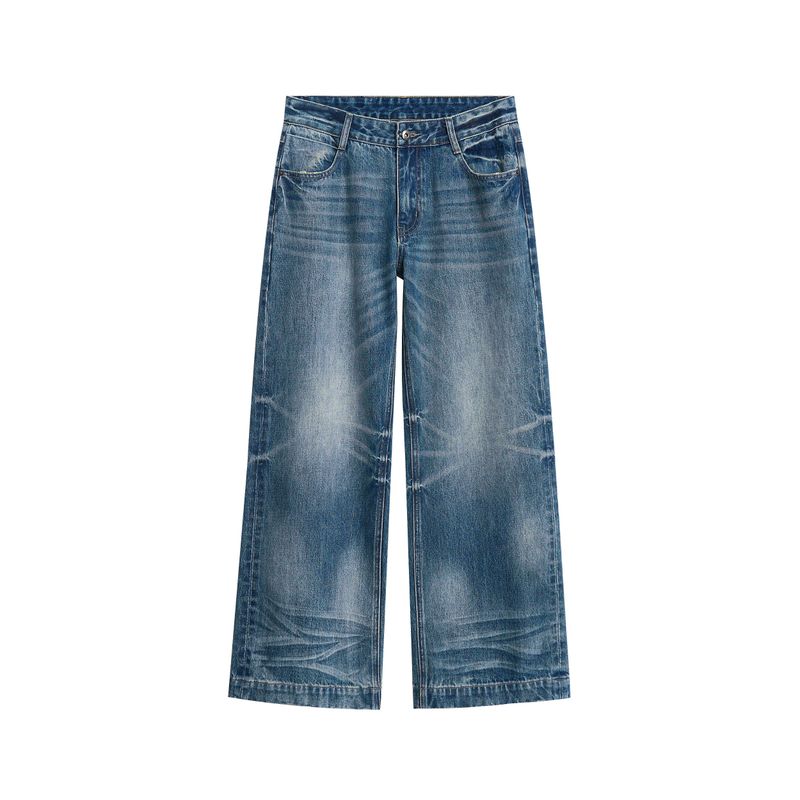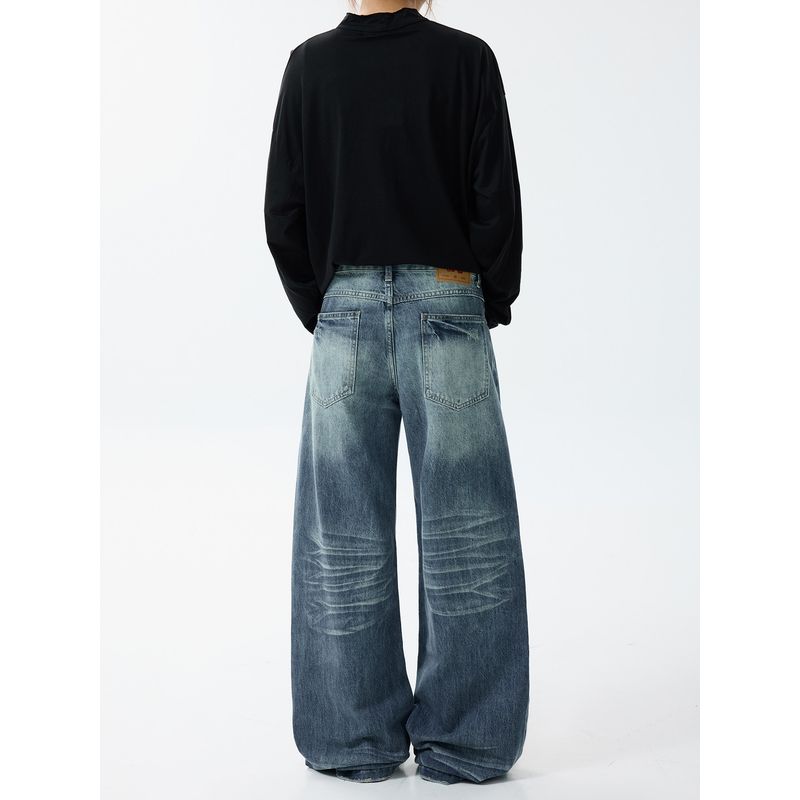 Blaexit Джинсы темно-синие унисекс, А-силуэта, с потертостями, стирка, американский стиль, крой Cleanfit, свободные, прямые, широкие штанины