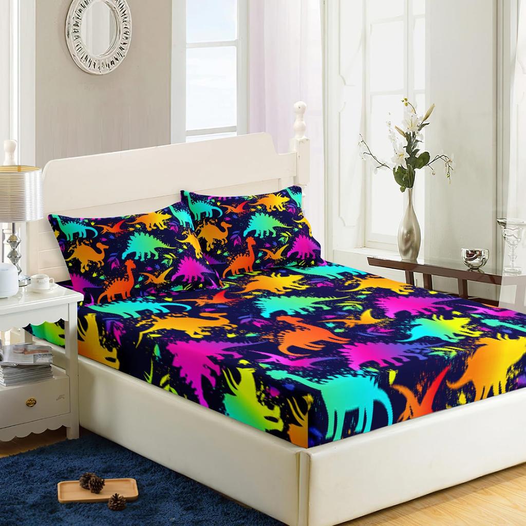 Многоцветный мультяшный узор с динозаврами, шапка на кровать из трех частей, цифровая печать, милый узор, постельный комплект — купить товар онлайн с бесплатной доставкой по всему миру!