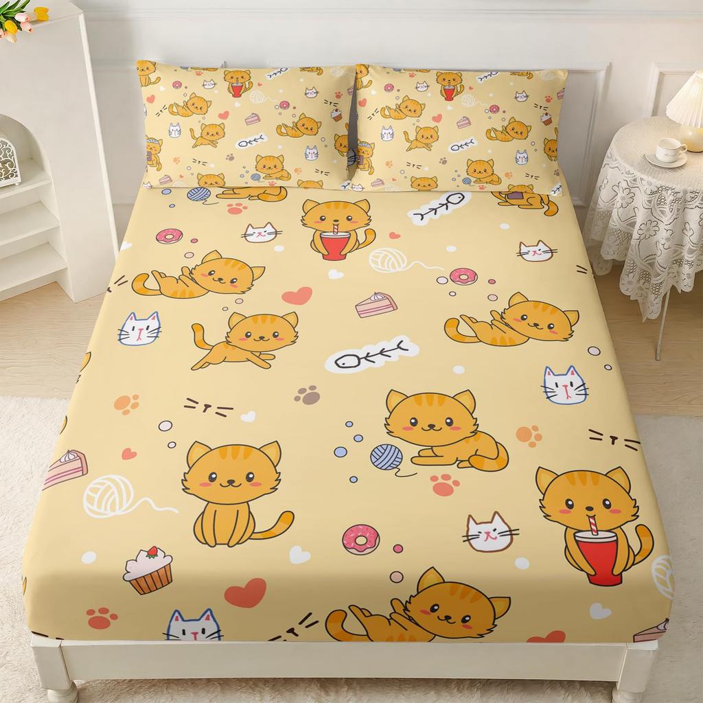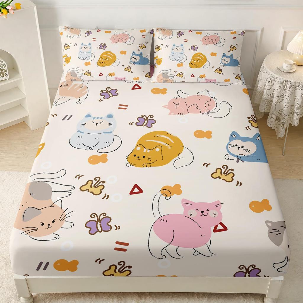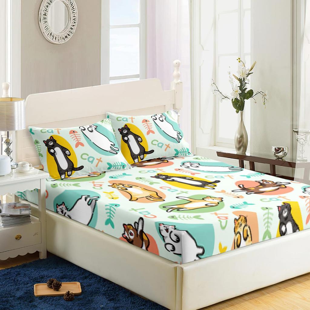 Милый мультяшный котенок узор Шапочка для кровати Набор постельного белья из трех предметов Цифровая печать Взрослые Дети