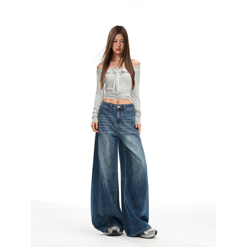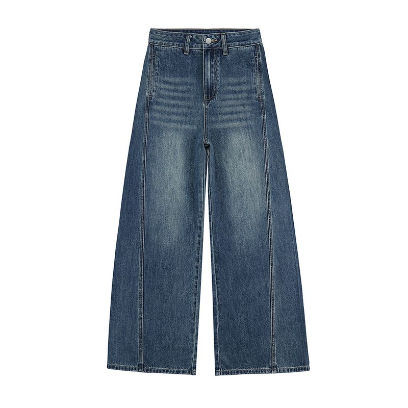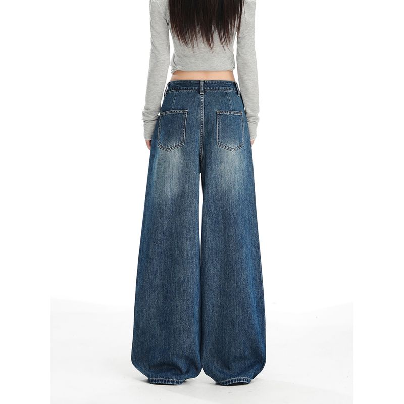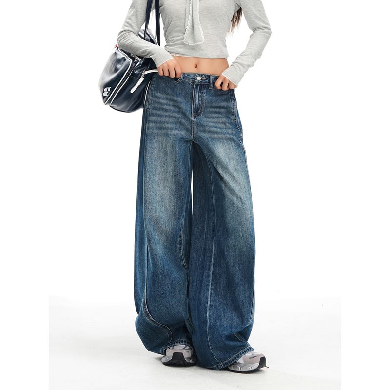 High-Waisted, Casual, Retro Blue Wide-Leg Pants for Women, Autumn Straight-Leg, Loose-Fitting, Hip-Covering, Loose-Fitting, Floor-Length Jeans