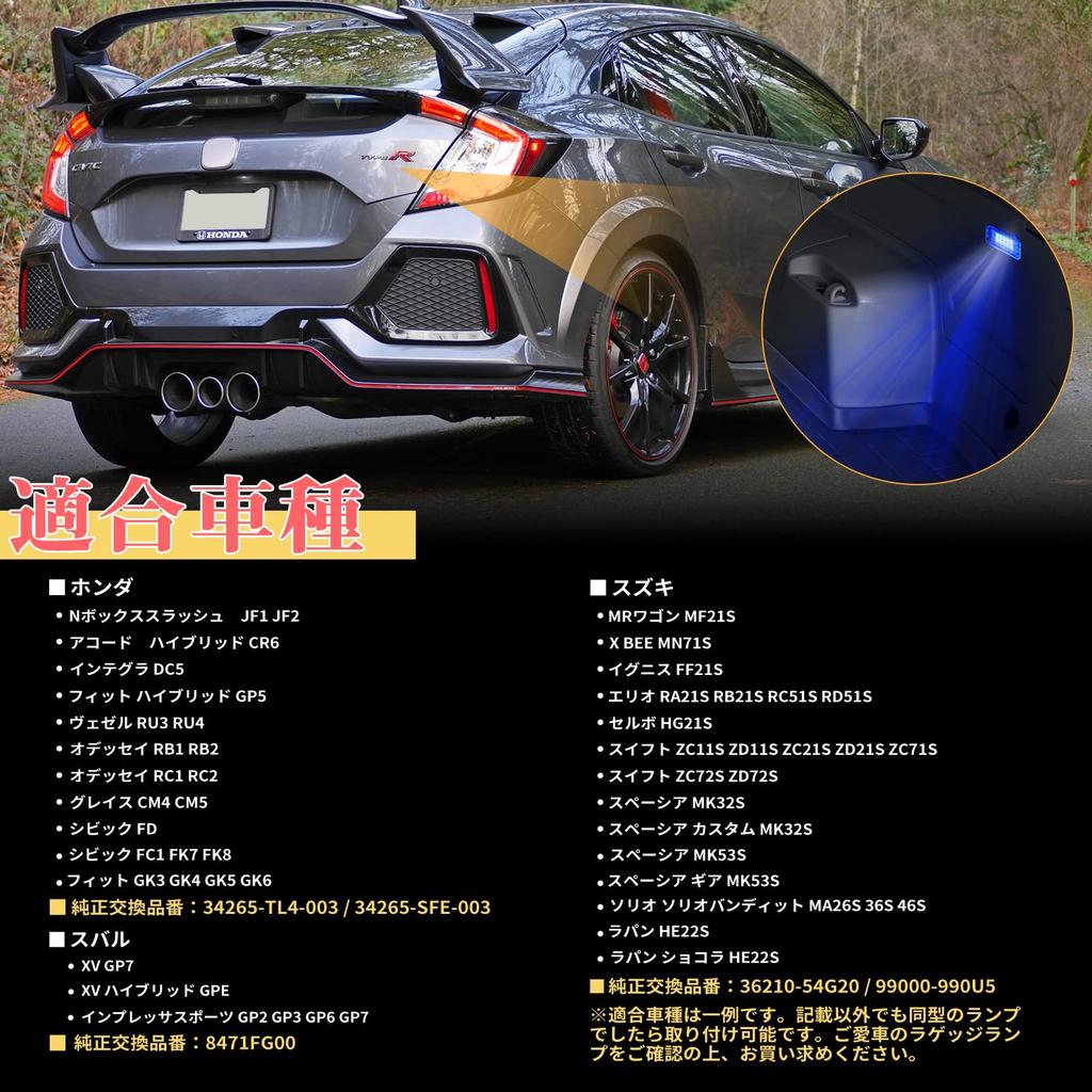 N-Box Slash JF1 JF2, Accord Hybrid CR6, Integra DC5, Vezel RU3 RU4, Odyssey RB1 RB2 RC1 RC2, Grace CM4 CM5, Civic FD FC1 FK7 FK8, Fit GK3 GK4 GK5 GK6 Hybrid GP5 XV GP7 GPE, Impreza Sport GP2 GP3 GP6, MR Wagon X BEE, Aerio Cervo, Swift, Spacia, Solio, Solio Bandit, Lapin, Chocolat, LED luggage lamp, room lamp