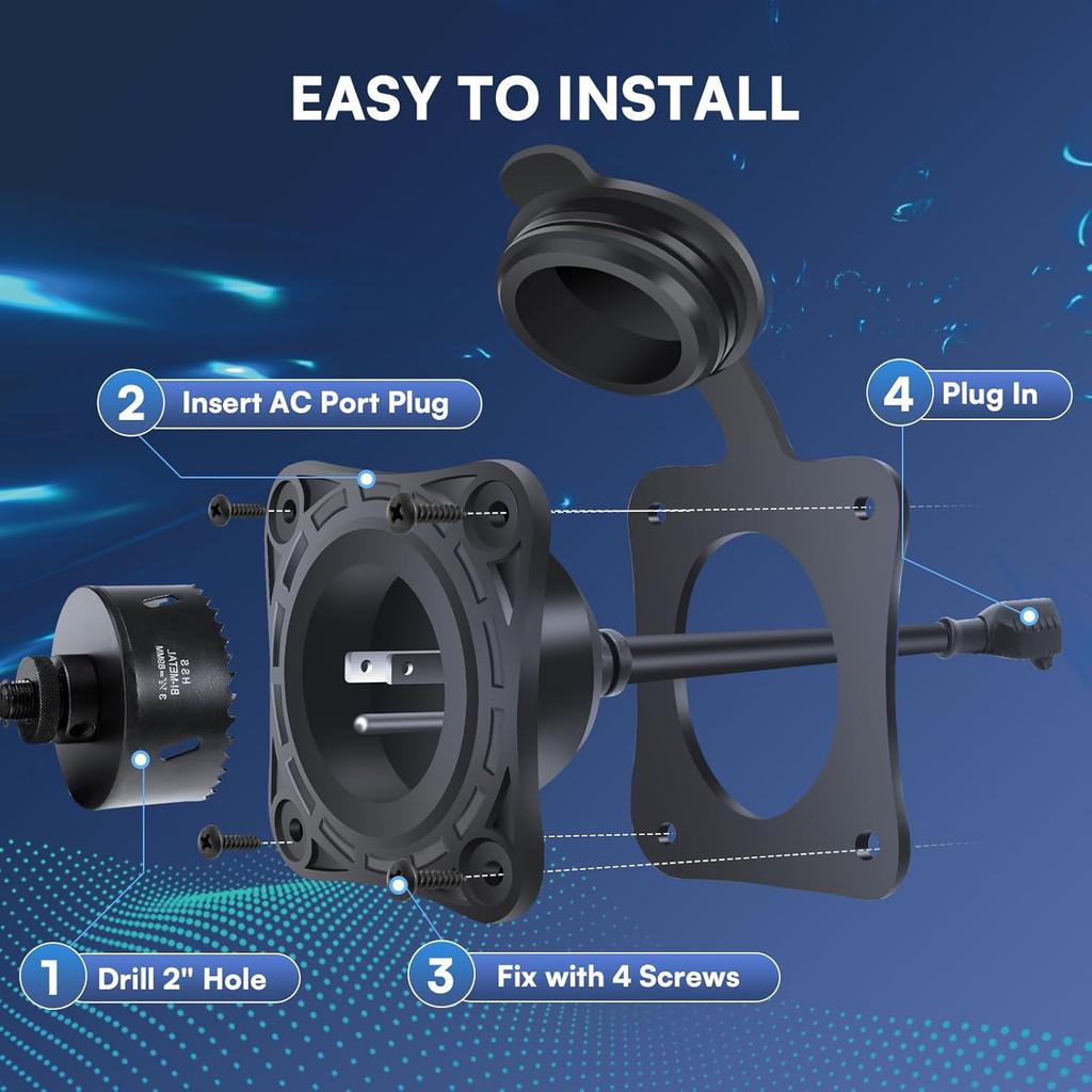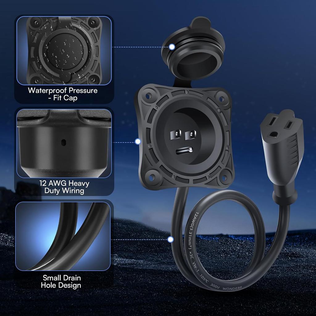 1 Pack 15 Amp RV Shore Power Inlet Socket,125V AC Port RV Plug Receptacles 18" NEMA 5-15 Integrated Extension Cord Waterproof Outlet Electrical
