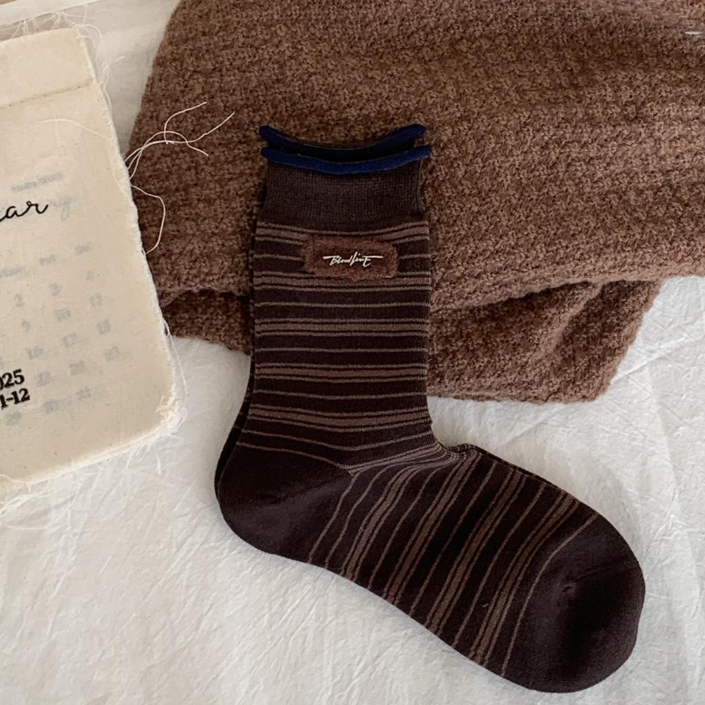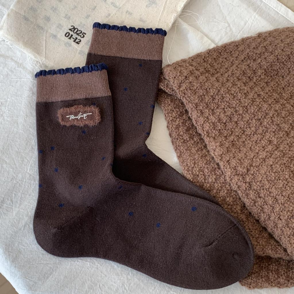 Socks European Goods Vintage Polka Dot Stripe Flocked Fabric Label Contrasting Mid-Leg Socks Maillard Coffee Cotton Socks Socks