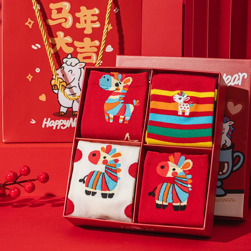 Gift Box Red Socks Pure Cotton Medium Tube Socks Season Cute Cartoon Year Of The Horse Big Red Stockings Women