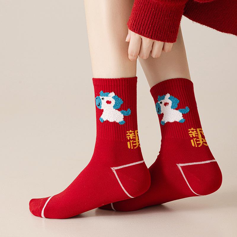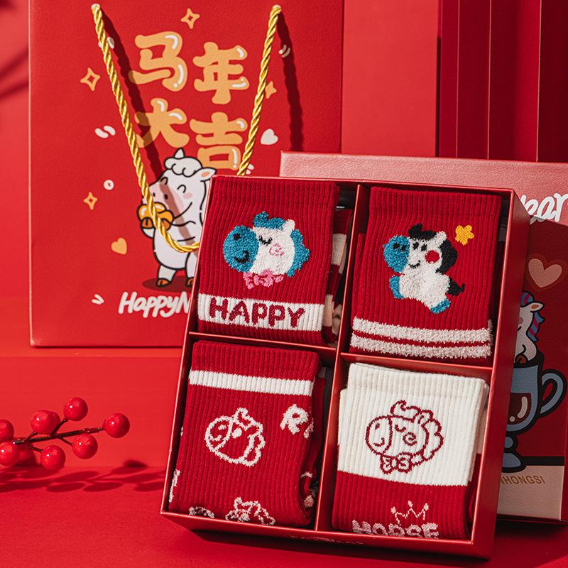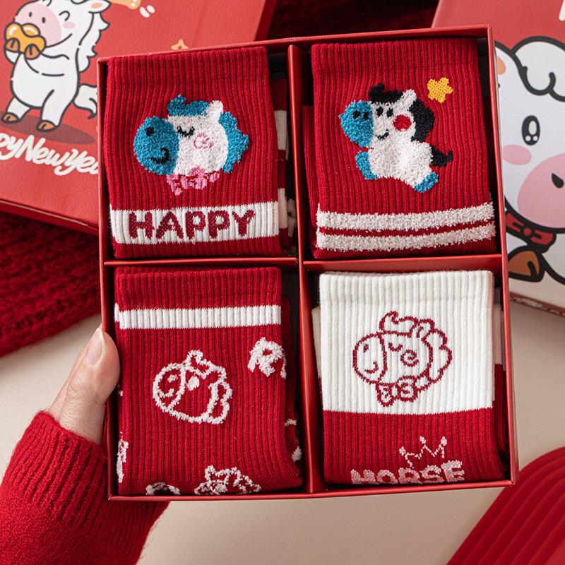 Gift Box Year Of The Horse Red Socks Pure Cotton Medium Tube Socks Cute Flocked Wedding Festive Big Red Stockings