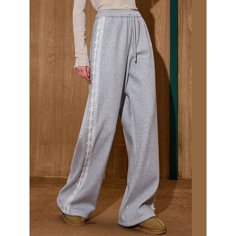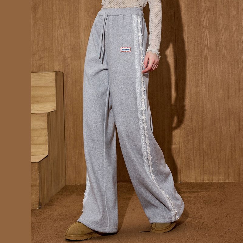 Coolhut Кружевные Брюки с Завышенной Талией, Драпированные, на Кулиске, Свободные, Широкие, на Флисовой Подкладке, 2025 Зима, Женские Повседневные Брюки