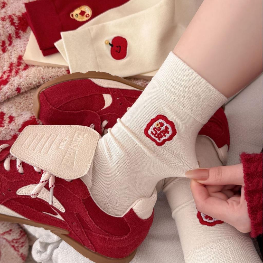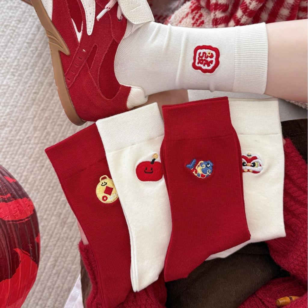 Red Socks Year Of The Dragon Red Socks Embroidered Cotton Socks Cute Festive New Year Medium Tube Wedding Stockings