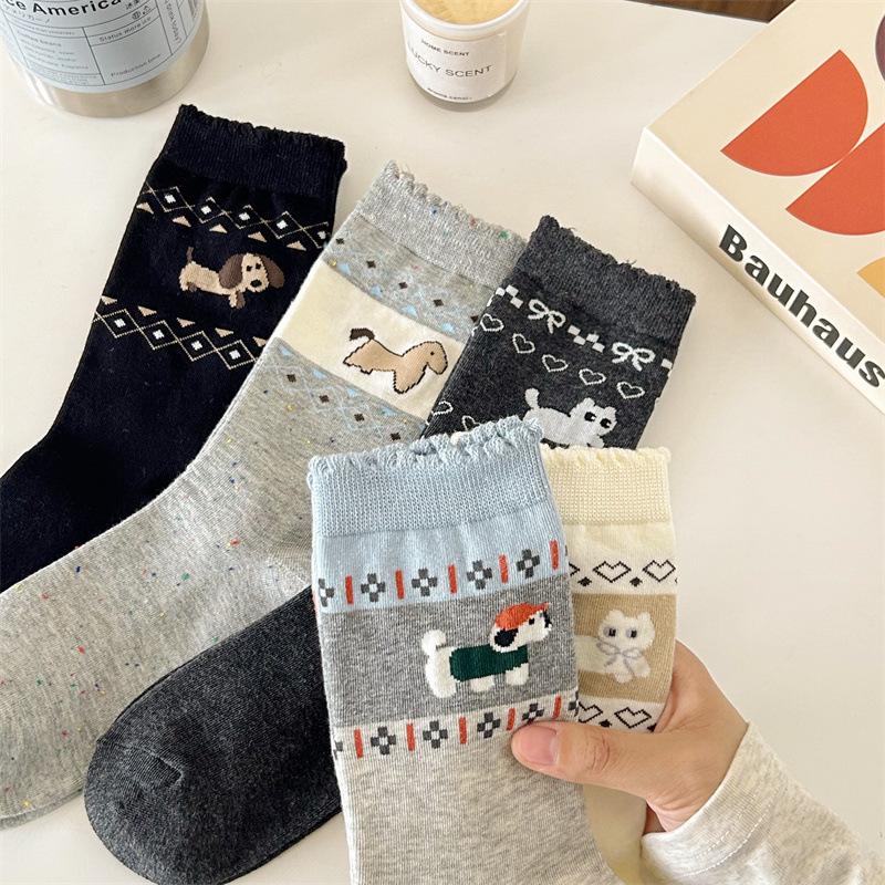 Puppy Boneless Socks Medium Tube Socks Cartoon Dog Cute Medium Tube Female Black