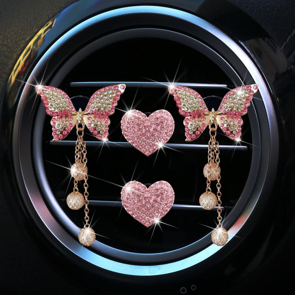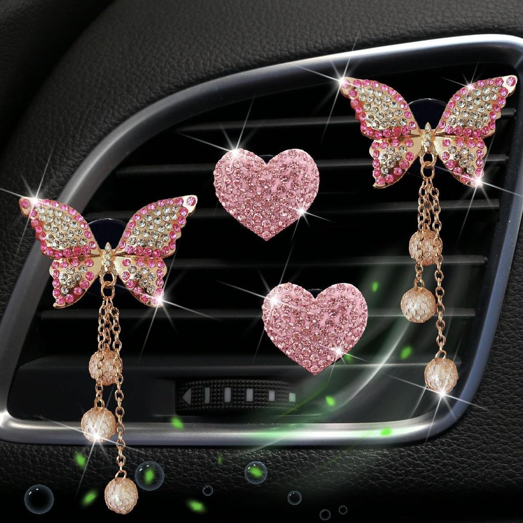 Pink Heart & Butterfly Air Vent Clips, 4 Pcs Bling Heart & Butterfly Air Fresheners Vents Clips Diamond Car Interior Decor Bling Cute Pink Car