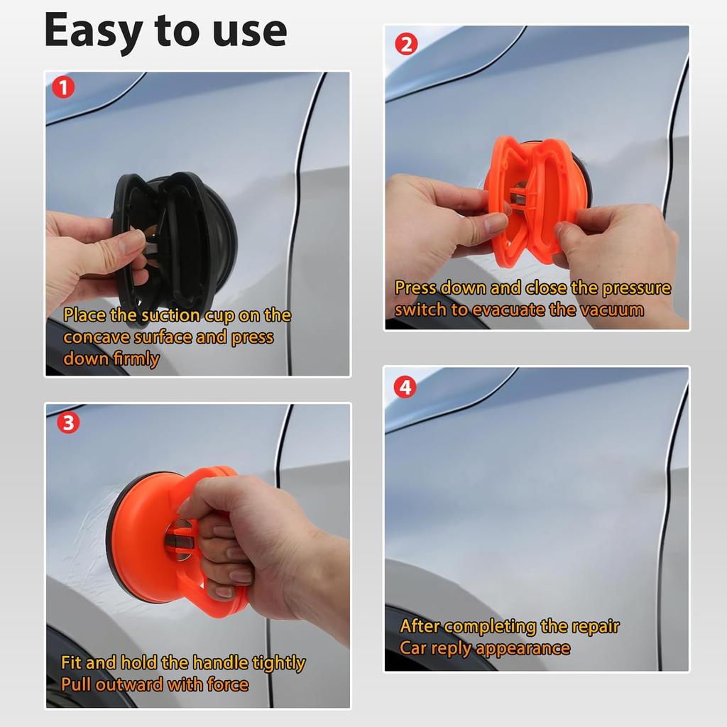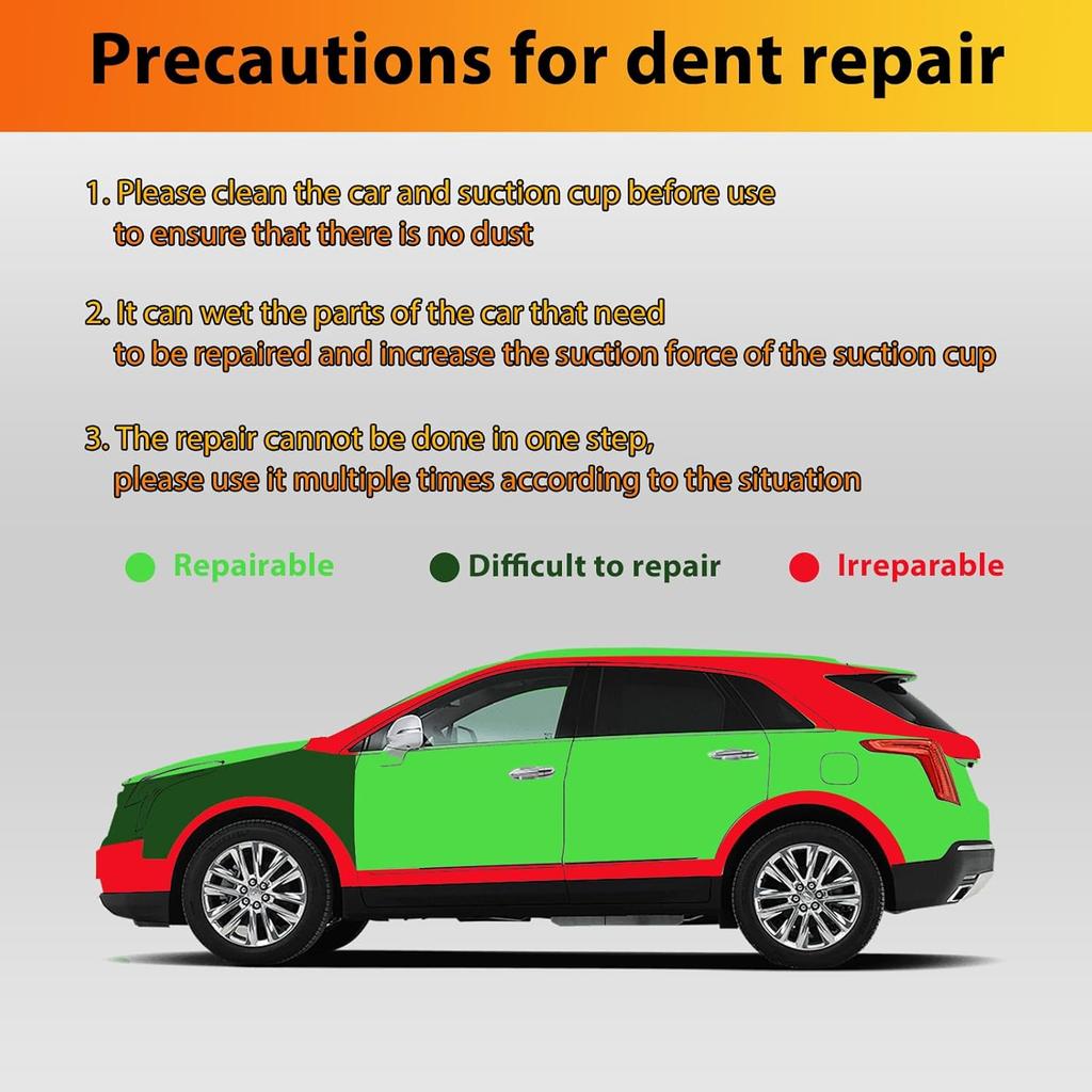 【Теплое напоминание】Пожалуйста, убедитесь, что набор для ремонта вмятин автомобиля используется на чистой, гладкой, плоской, сухой поверхности. Перед тем как тянуть, убедитесь, что присоска для удаления вмятин прочно прилипла к поверхности вмятины, и внимательно подтвердите, что область вмятины больше диаметра присоски.