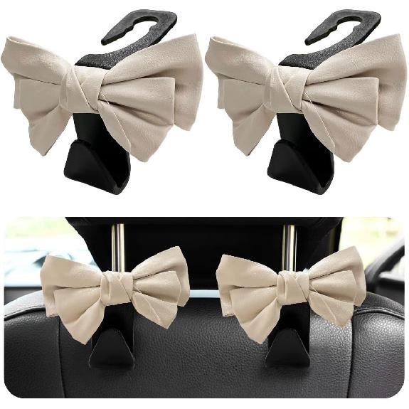 2 PCS Car Seat Headrest Hooks, Cute Bow Shaped Vehicle Backseat Storage Hooks, Leather Bow Shaped Sturdy Car Seat Back Hooks For