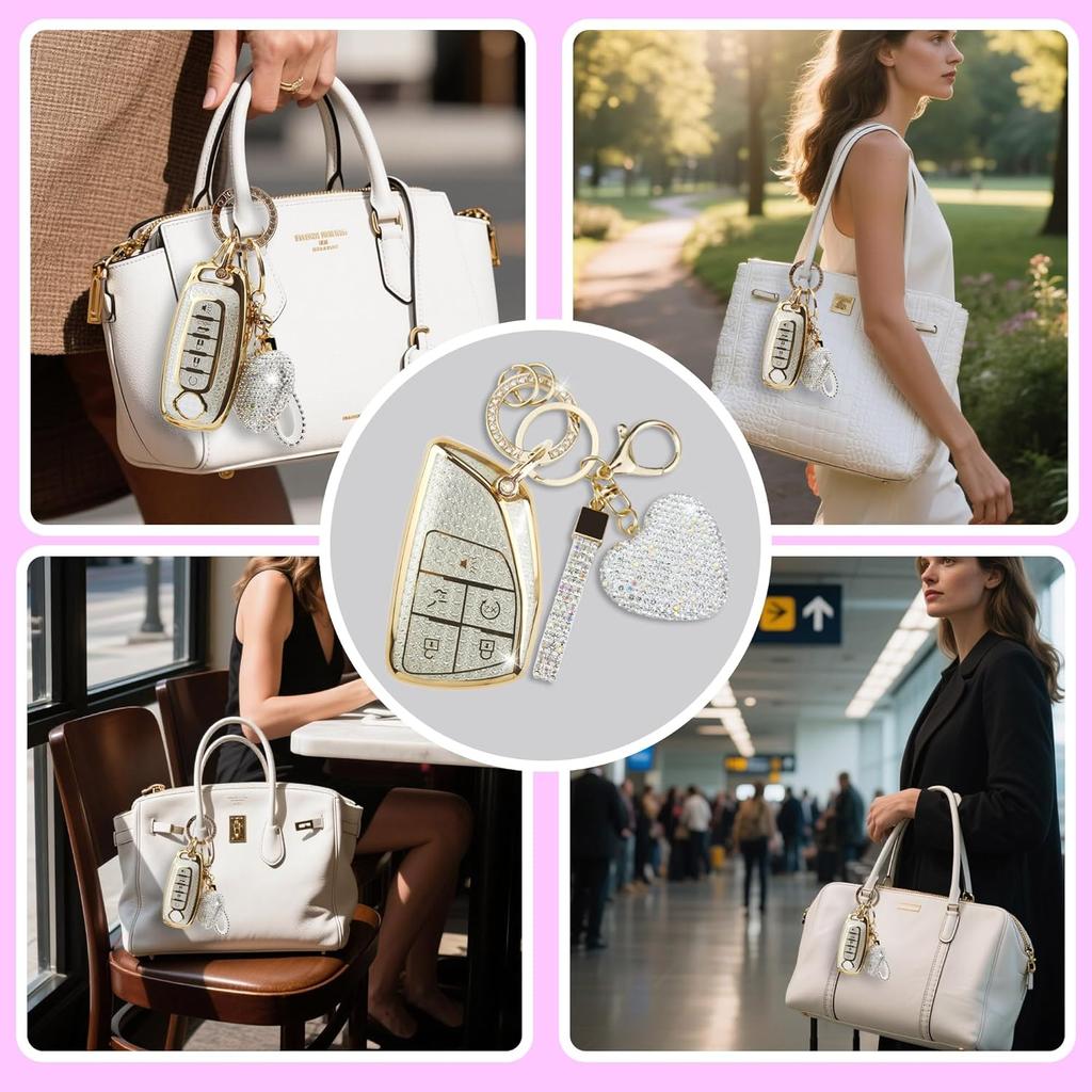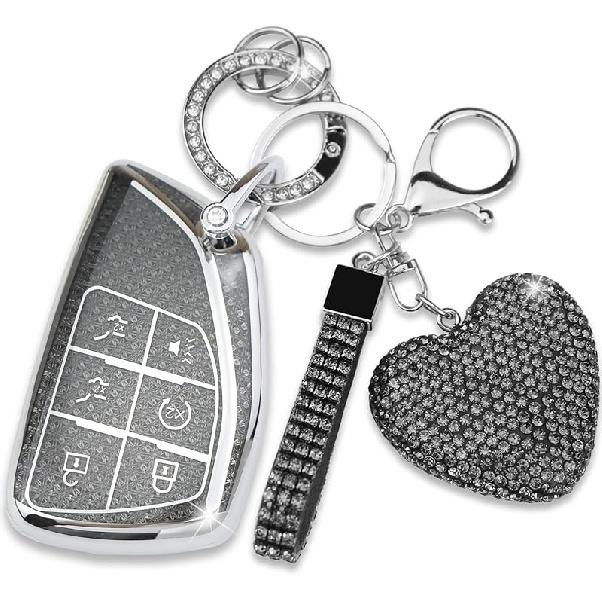 Key Fob Cover With Diamond Heart Keychain Car Key Shell Compatible With -2024 Chevy Tahoe Suburban GMC Yukon Denali Silverado Buick Full Protector