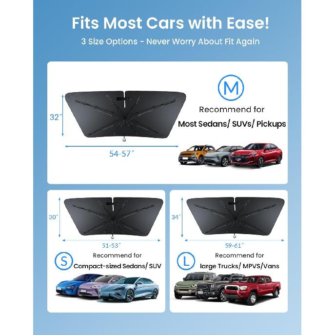【Совместим с 99% автомобилей】Устали от солнцезащитных экранов на лобовое стекло, которые не подходят по размеру? Мы решили самую большую проблему на рынке — плохую совместимость. Наше последнее обновление включает гибкий наконечник с двойной пружиной, который подстраивается под угол вашего лобового стекла, автомобильный солнцезащитный козырек надежно крепится. Больше никаких жестких, колючих удилищ, которые рискуют треснуть! С 3 умными размерами на выбор, просто измерьте лобовое стекло перед покупкой, чтобы получить идеальную посадку, 2-секундная установка защищает ваш интерьер.
