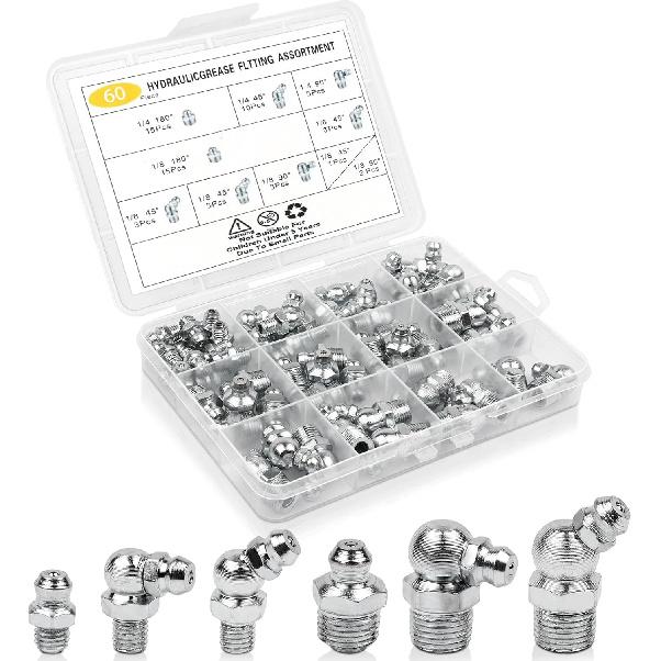 Набор из 60 шт. пресс-масленок, ассортимент пресс-масленок BSP 1/4 и 1/8 дюйма под углами 90°, 45° и прямых для автомобилей, тракторов,