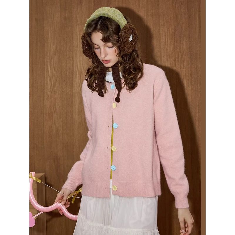 Coolhut Sweet Girly Fashion Pink Button Slimming Loose Versatile 025 Autum Women's Long-Sleeved Sweater