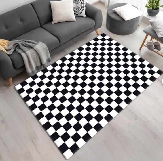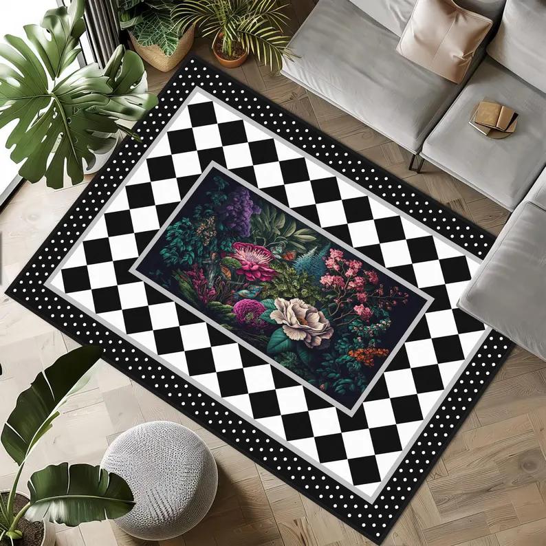 Белый и Черный Клетчатый Ковер с Цветочным Узором Ковер Красивый Яркий Цветочный Ковер Индивидуальное Украшение Дома