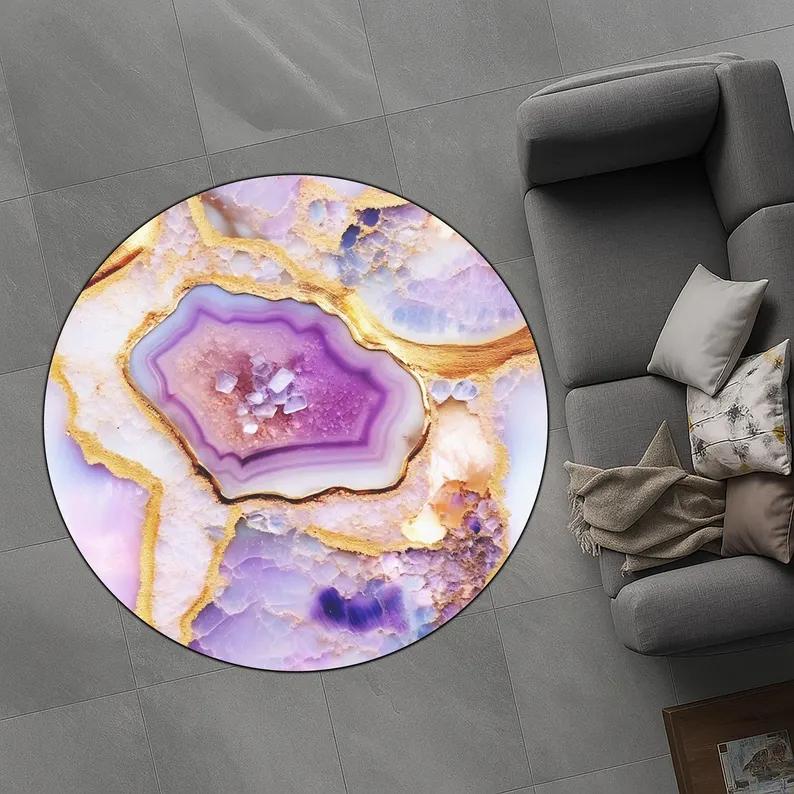 Amethyst Diamond Geode Round Rug Lavender Gold Marble Print Bedroom Living Room Carpet Blue Green Marble Pattern Mat