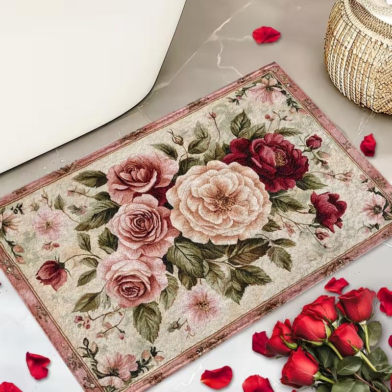 1 шт. Элегантный коврик для пола с принтом розы и зелени, с нескользящей входной накладкой, подходит для гостиной и спальни