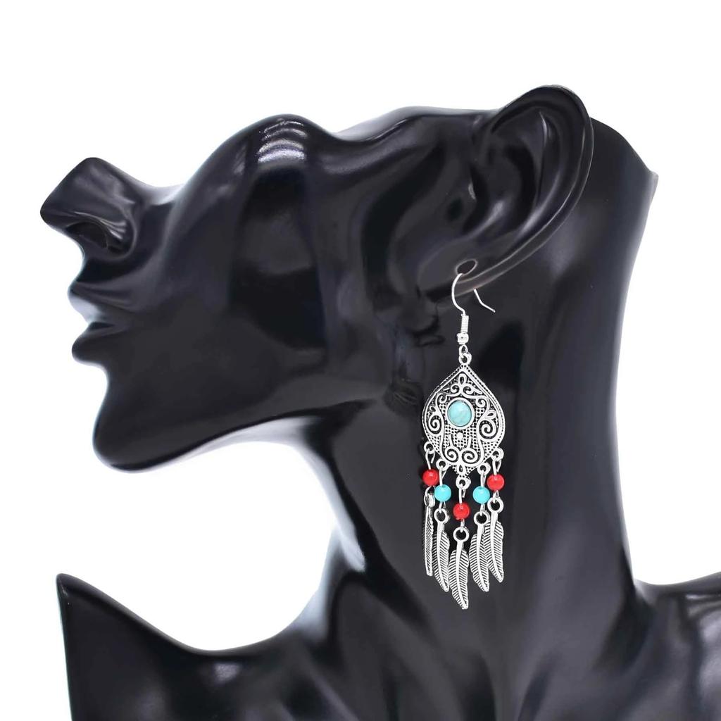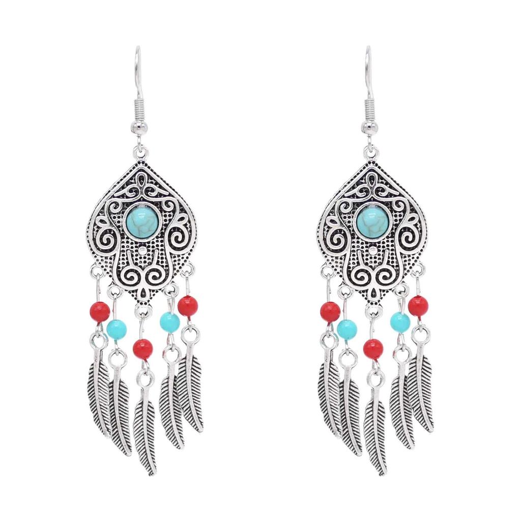 Бирюзовые серьги в этническом стиле с гравировкой, серьги с бахромой из перьев из сплава, ретро серьги с бусинами