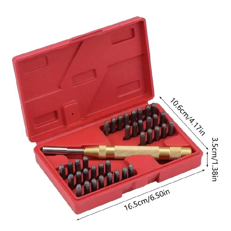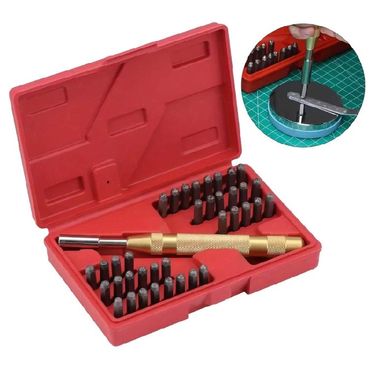 В комплект инструмента для тиснения изделий из кожи входят 26 инструментов для пробивки букв, 9 инструментов для пробивки цифр, 2 инструмента для пробивки символов, 1 металлическая ручка для тиснения, 1 футляр для хранения.. Примечание: номера 6 и 9 имеют один и тот же штамп!