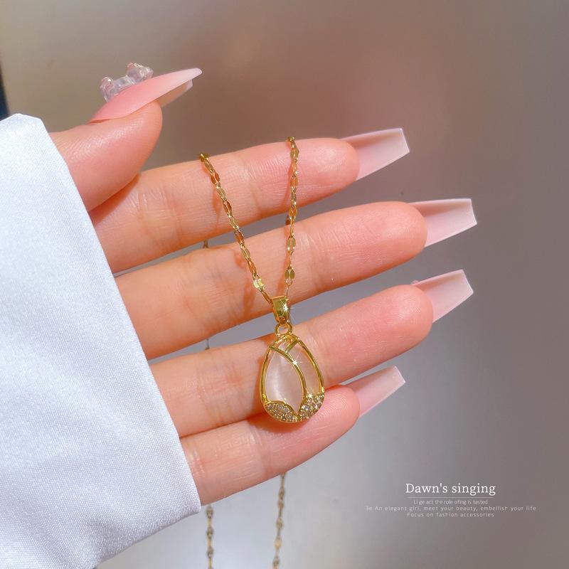 Titanium Steel Light Luxury Full Diamond Micro-Inlaid Zircon Tulip Opal Necklace Copper Electroplated Real Gold Pendant