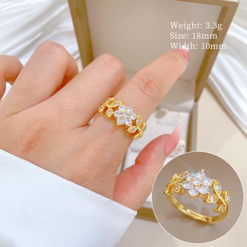 Real Gold Light Luxury Flower Full Diamond Ring Opening Adjustable Simple Jewelry Japanese Ring Couple Ring