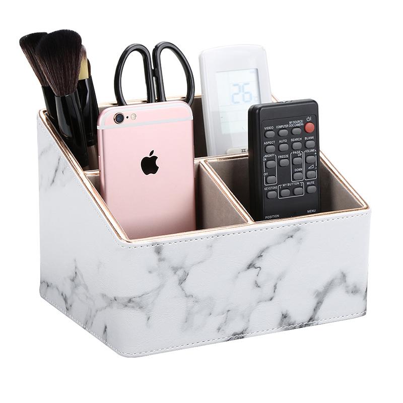 Multi-Functional 3 Compartments Wooden Storage Box Gold Edge Marble Faux Leather Desk Organizer Remote Controllers Holder Case