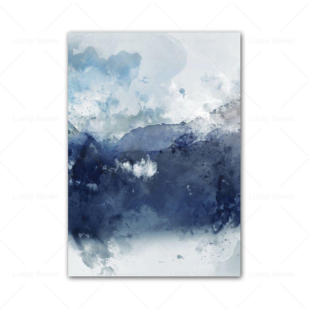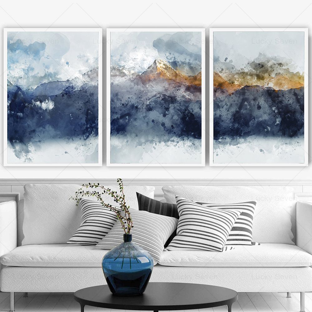 Темно-синий Золотые горы Абстрактное настенное искусство Холст Картина Современная природа Акварельные произведения искусства Принты Постеры Декор для гостиной