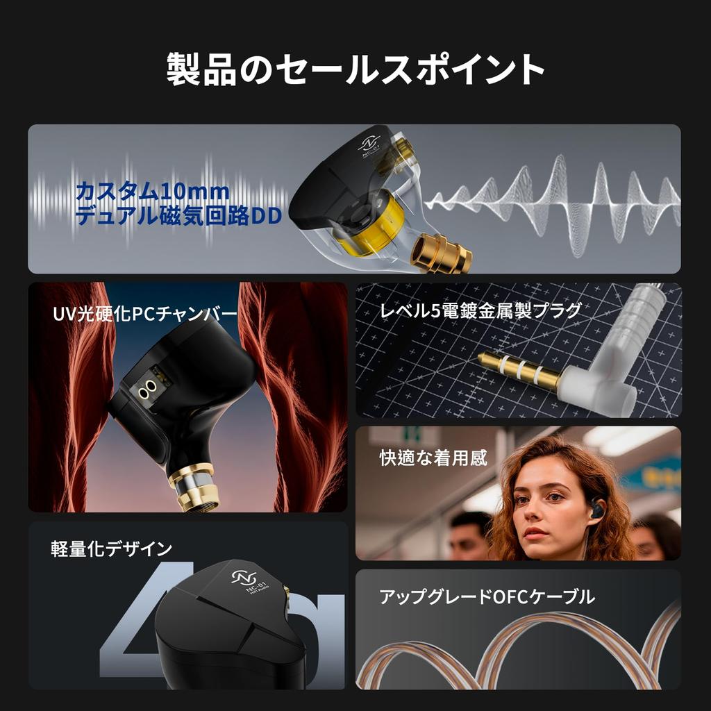 [OFC parallel cable & built-in microphone version] The NC01 wired earphones use a parallel cable made of high-purity OFC silver-plated. High-frequency resolution is improved, resulting in crystal clear sound quality. Special braiding increases strength by 50%, and the tangle-resistant design makes them comfortable to use even when exercising. The built-in microphone version of the in-ear monitor earphones is equipped with noise cancelling for clear calls. Low latency and high-definition audio can be reproduced. A high-performance wired in-ear monitor that can be used for everything from business to entertainment, all in one unit.