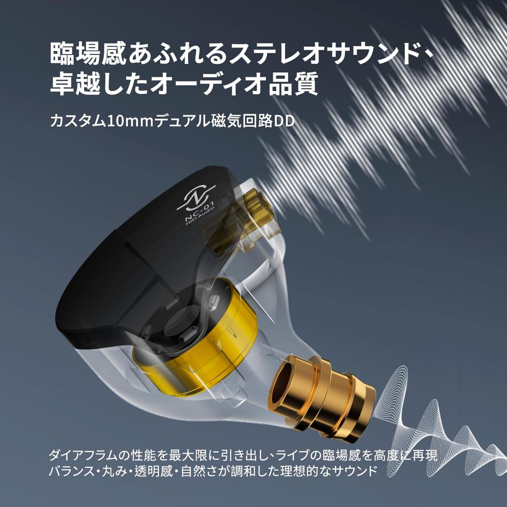 [A perfect fusion of UV light-cured PC housing technology and sound quality] The NC01 wired ear monitors combine high-density PC material with Nice-Fit UV light-cured technology, pursuing technology and aesthetics down to the smallest detail. The density of the PC material in the in-ear earphones is 15% higher than that of general materials, ensuring the rigidity of the housing and suppressing unnecessary resonance, reproducing pure sound quality. The surface of the black in-ear earphones is coated with Nice-Fit UV light-cured paint, forming a protective layer with a mirror-like finish. Its high hardness and abrasion resistance protect it from scratches. The transparent black design of the wired earphones allows for a clear view of the internal structure, creating a beautiful harmony between music and technology.