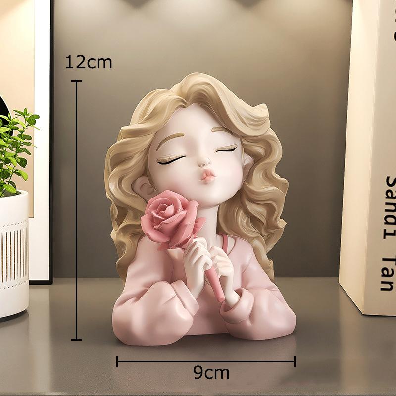 Lovely Wave Haired Girl Figures Rose Flower Statue Desk Decoration Exquisite Character Resins Sculpture Room Aesthetics Decor