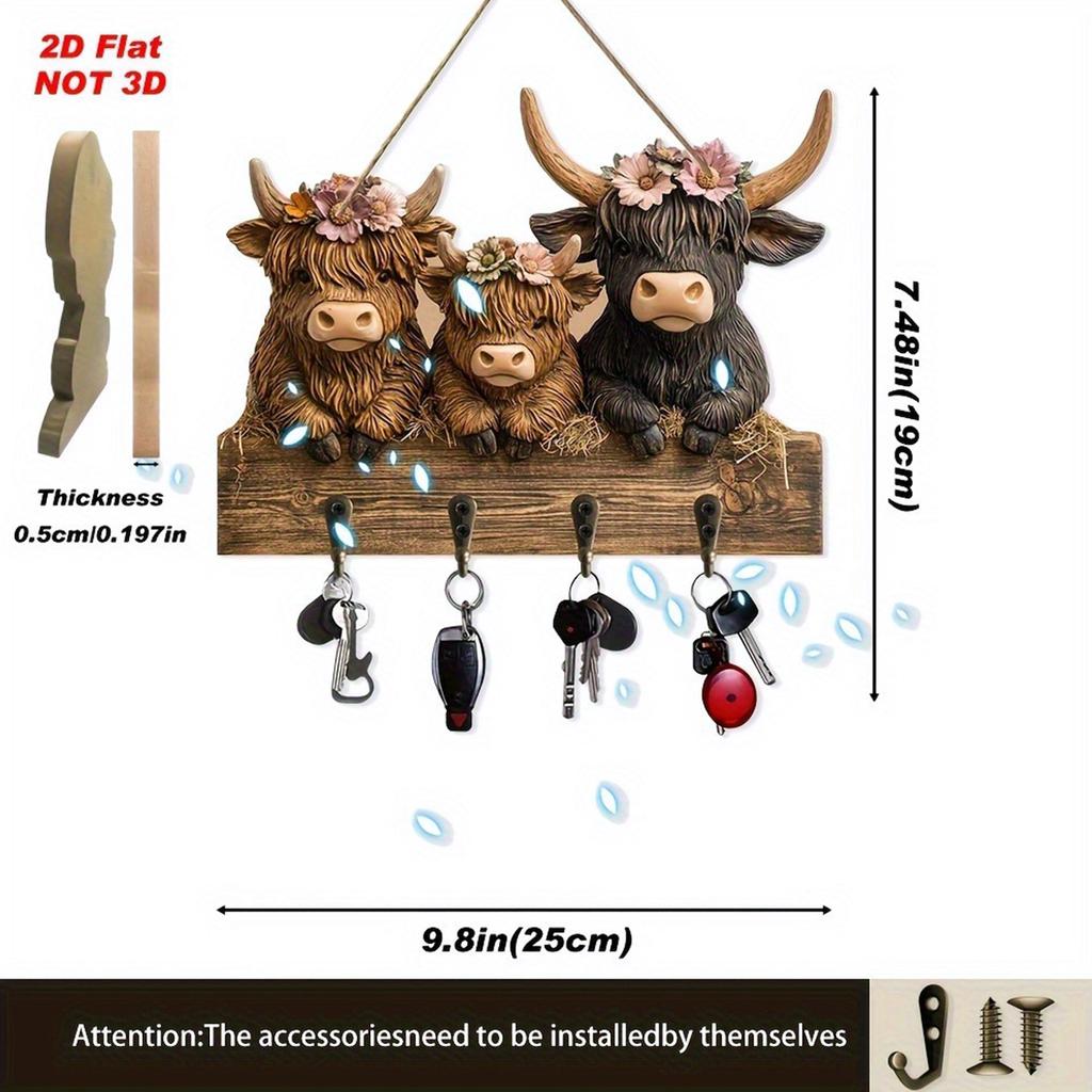 Highland cow-shaped wall-mounted key rack 2D bull head animal wooden towel and