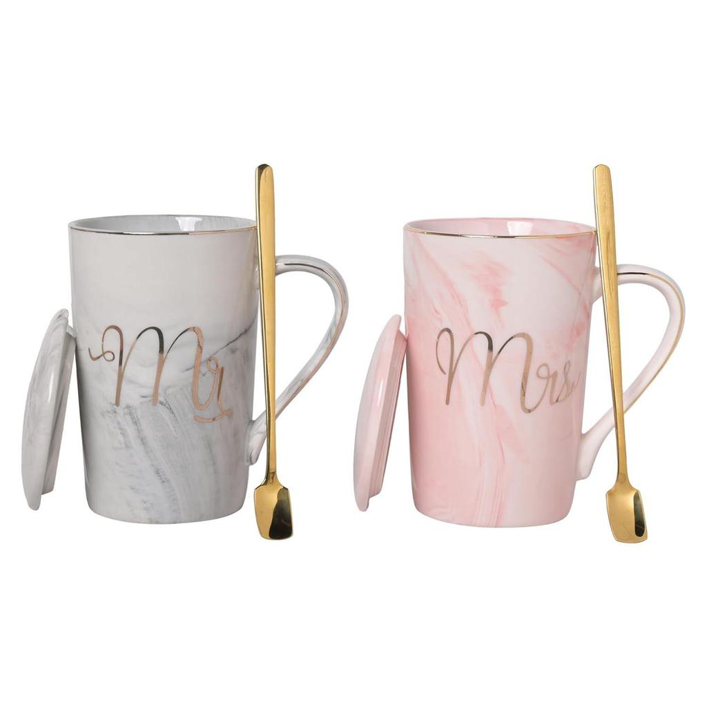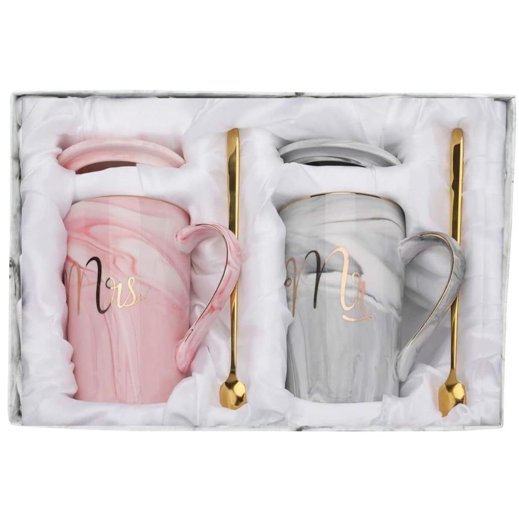 Included Components Mr. Mrs. Set Of 2 Coffee Mugs, 2 x Lids, 2 x Golden Spoon, And Beautiful Gift Box