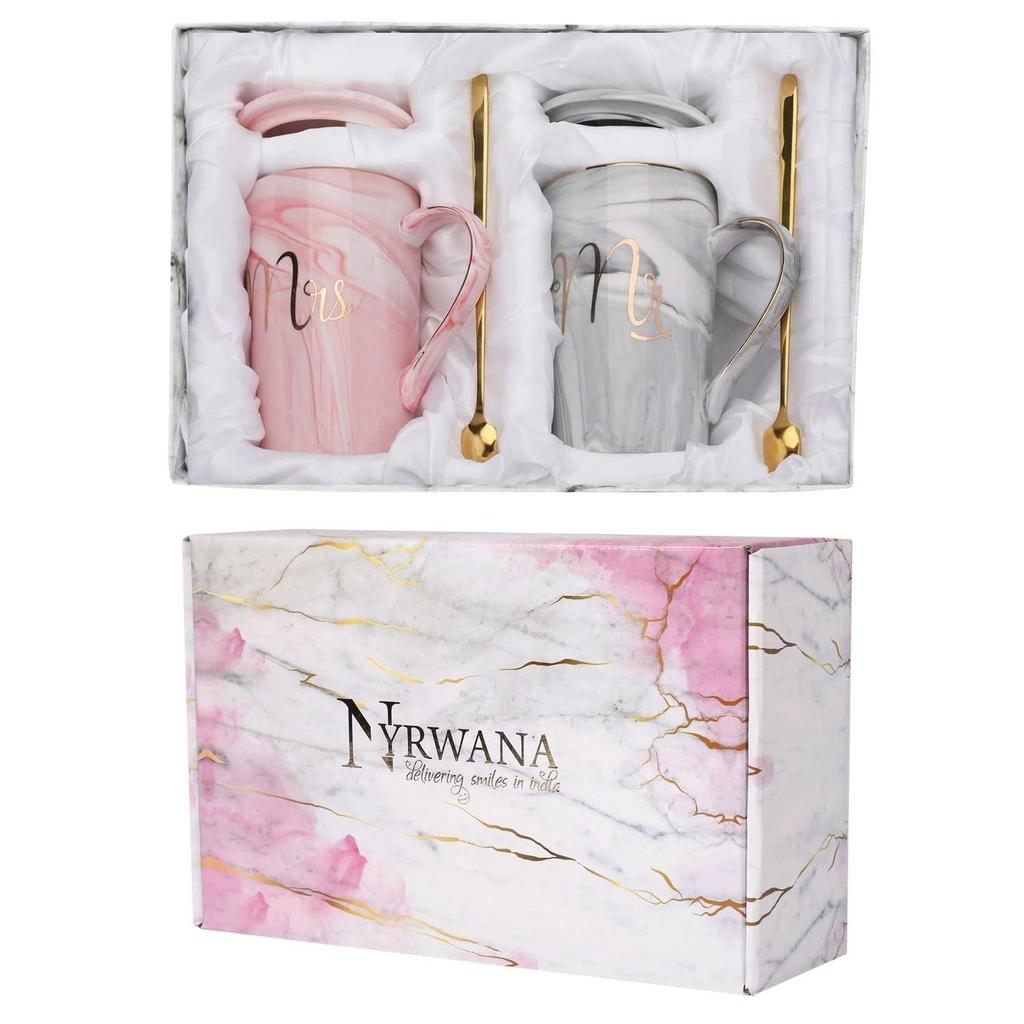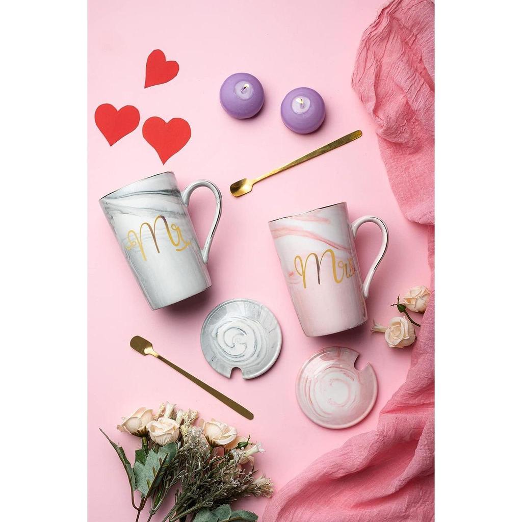 Coffee Mug, Marriage Gifts for Wedding, Wedding Present for Couples, Couple Present, Christmas Gifts, Mr & Mrs Set of 2 Coffee Mugs, Lids, Golden Spoon and Beautiful Gift Box (380ml-Ceramic)