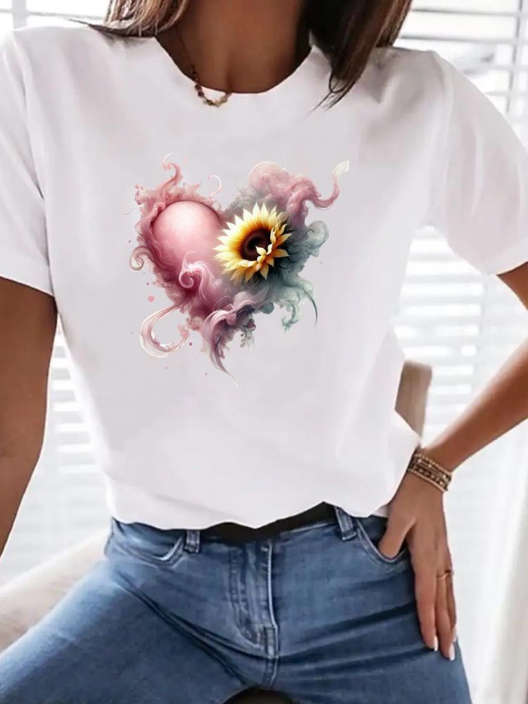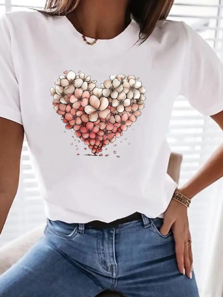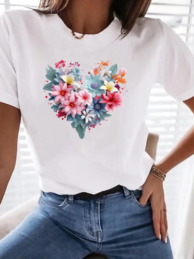 (Азиатский размер) Женская футболка с принтом в милом цветочном стиле, модная женская футболка с коротким рукавом и графическим рисунком.