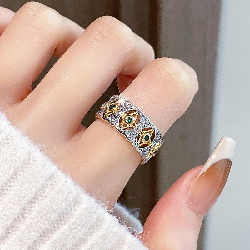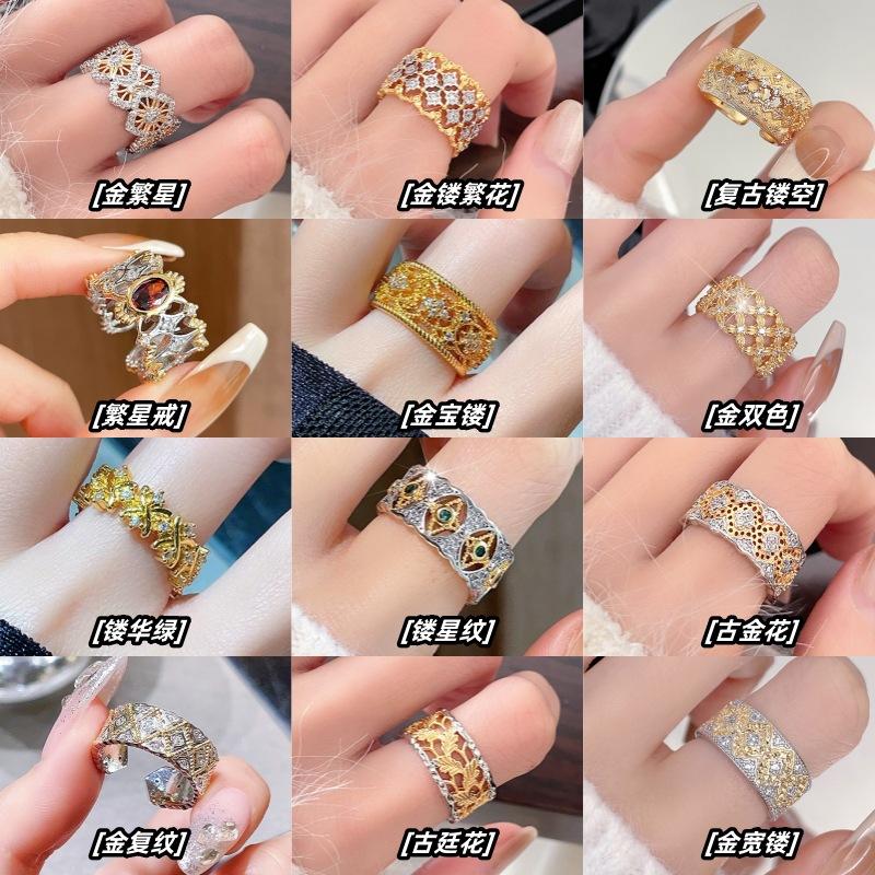 Золотое кольцо с полым узором в стиле ретро, открытое, с высоким чувством стиля, средневековое, двухцветное, в классическом придворном стиле, с цирконом