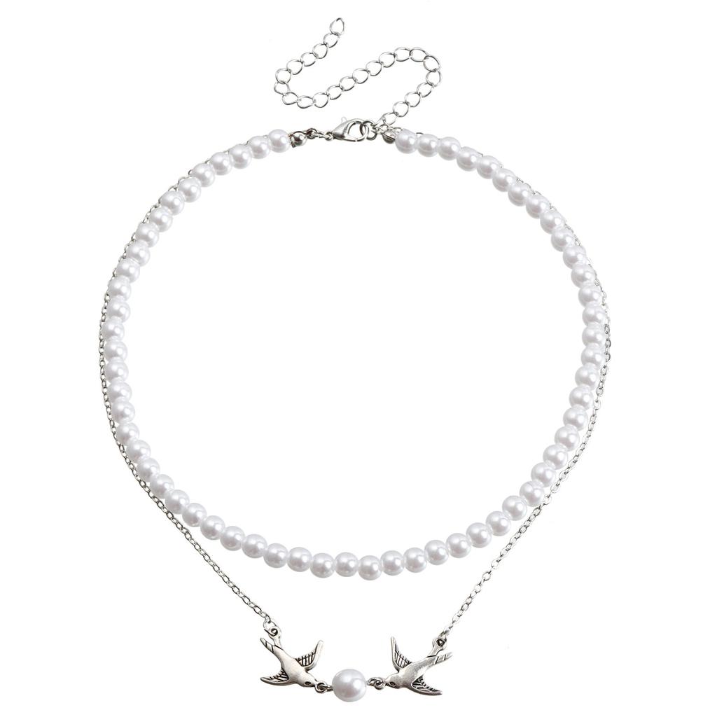 Valentine'S Day Lobe Double Beaded Mixed And Matched Metal Chain Necklace Ins Imitation Pearl Double Flying Swallow Necklace Female