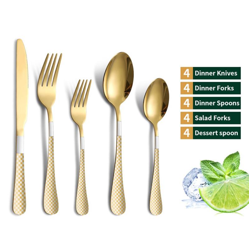 Набор столовых приборов из 20 шт., клетчатый узор, зеркальная отделка, гладкие края, набор вилок, ложек из нержавеющей стали