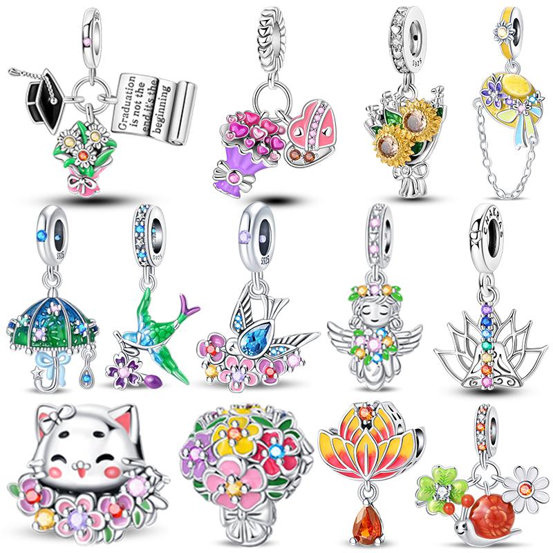 925 Sterling Silver Bouquet of Flowers Cat Swallow Snail Butterfly Pendant Charms Beads Fit Bracelet DIY Birthday Jewelry Gift
