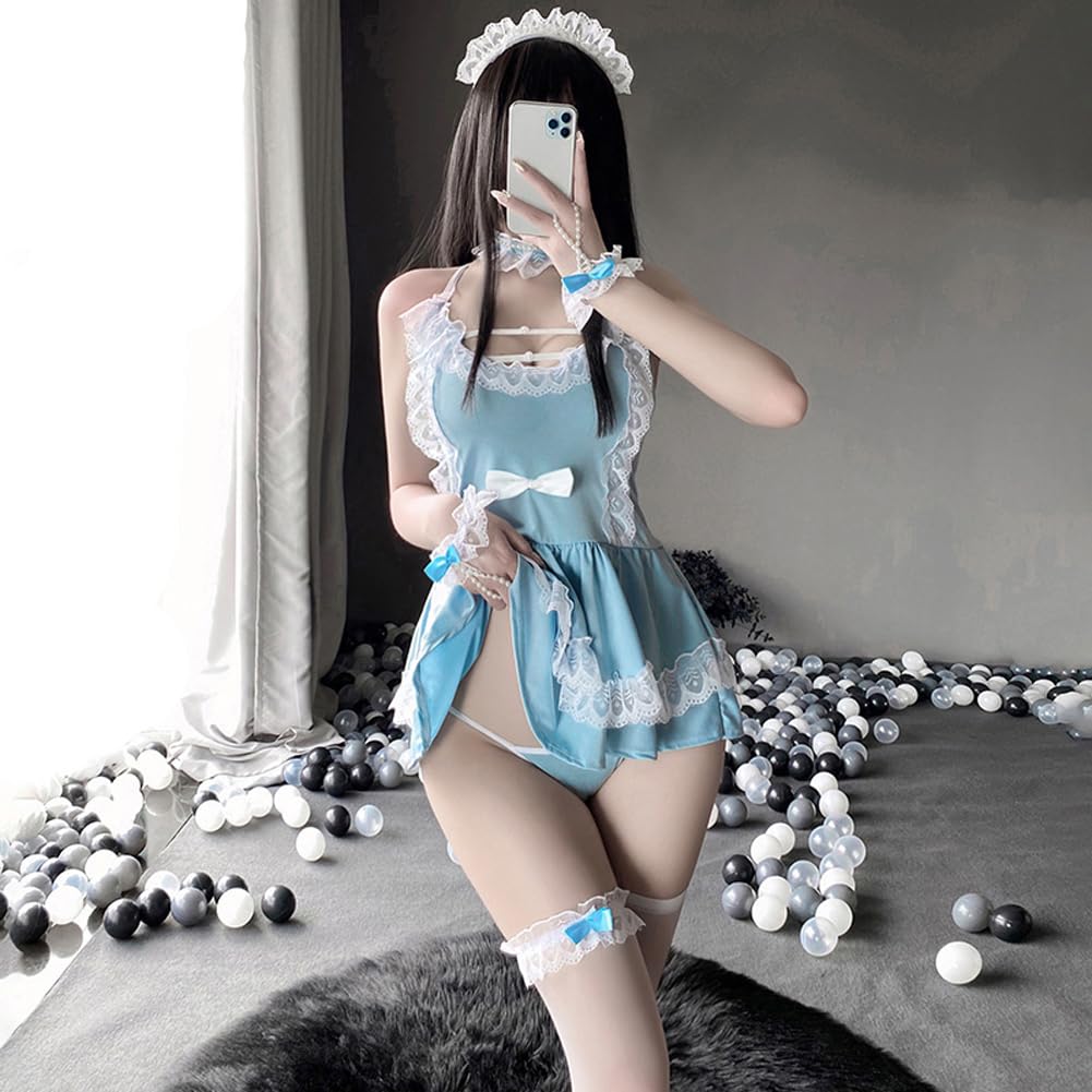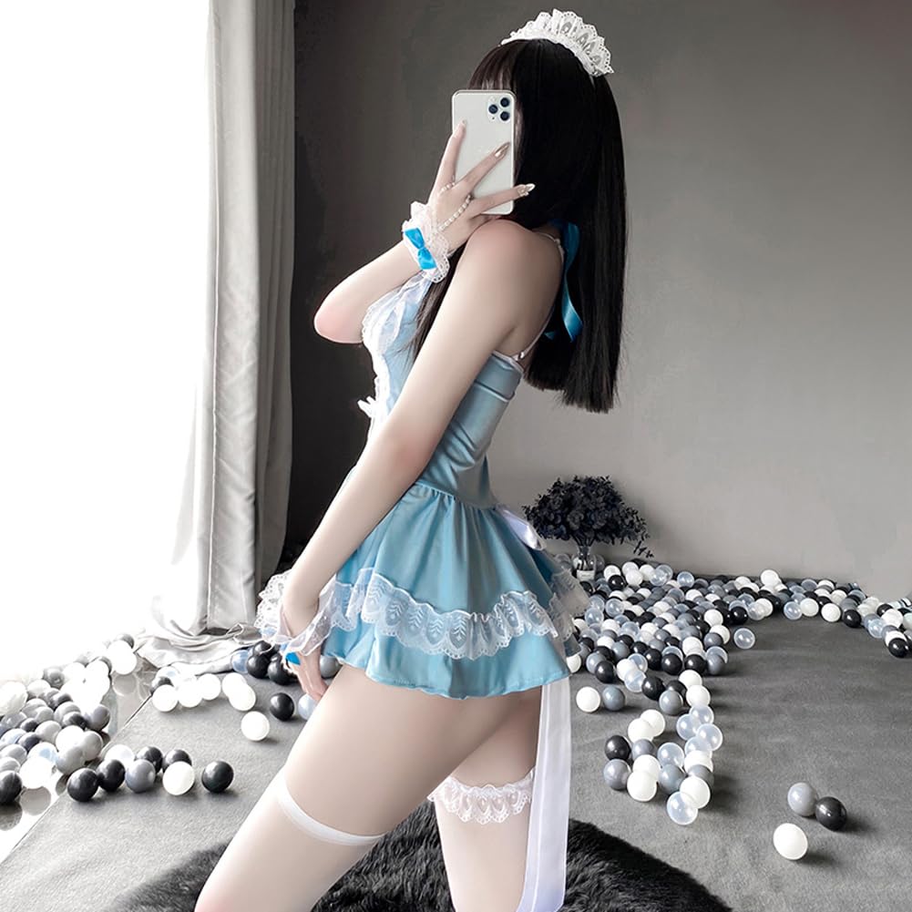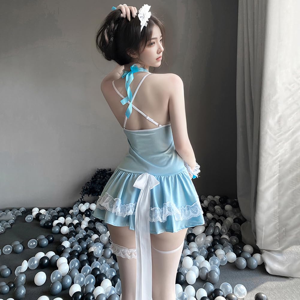 Baioretto Maid Blue and White Maid Babydoll Adult One Size Fits Includes Stockings Cosplay, Sexy, Extreme, Cute, Cosplay, Innocent-Style Dress,